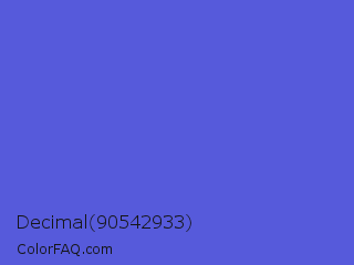 Decimal 90542933 Color is a normal blue color and the nearest color is Majorelle Blue #6050dc. Hex code #565adb and RGB value is rgb(86,90,219). In RGB color space, this color is composed of 34% red, 35% green, 86% blue, In CMYK color space, this color is composed of 61% cyan, 59% magenta, 0% yellow , 14% black , In HSL color space, this color has a hue angle of 238° , 65% saturation and 60% lightness.