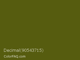 Decimal 90543715 Color is a very dark yellow color and the nearest color is Saratoga #555b10. Hex code #565c0f and RGB value is rgb(86,92,15). In RGB color space, this color is composed of 34% red, 36% green, 6% blue, In CMYK color space, this color is composed of 7% cyan, 0% magenta, 84% yellow , 64% black , In HSL color space, this color has a hue angle of 65° , 72% saturation and 21% lightness.