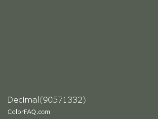 Decimal 90571332 Color is a normal green color and the nearest color is Ebony #555d50. Hex code #565e54 and RGB value is rgb(86,94,84). In RGB color space, this color is composed of 34% red, 37% green, 33% blue, In CMYK color space, this color is composed of 9% cyan, 0% magenta, 11% yellow , 63% black , In HSL color space, this color has a hue angle of 108° , 6% saturation and 35% lightness.