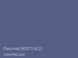 Decimal 90571412 Color is a normal blue color and the nearest color is Purple Navy #4e5180. Hex code #565e86 and RGB value is rgb(86,94,134). In RGB color space, this color is composed of 34% red, 37% green, 53% blue, In CMYK color space, this color is composed of 36% cyan, 30% magenta, 0% yellow , 47% black , In HSL color space, this color has a hue angle of 230° , 22% saturation and 43% lightness.