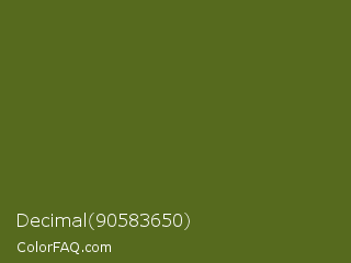 Decimal 90583650 Color is a dark lime color and the nearest color is Dark Olive Green #556b2f. Hex code #566a1e and RGB value is rgb(86,106,30). In RGB color space, this color is composed of 34% red, 42% green, 12% blue, In CMYK color space, this color is composed of 19% cyan, 0% magenta, 72% yellow , 58% black , In HSL color space, this color has a hue angle of 76° , 56% saturation and 27% lightness.