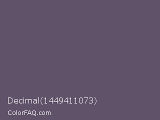 Decimal 1449411073 Color is a normal purple color and the nearest color is Scarpa Flow #585562. Hex code #605269 and RGB value is rgb(96,82,105). In RGB color space, this color is composed of 38% red, 32% green, 41% blue, In CMYK color space, this color is composed of 9% cyan, 22% magenta, 0% yellow , 59% black , In HSL color space, this color has a hue angle of 277° , 12% saturation and 37% lightness.