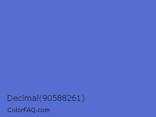 Decimal 90588261 Color is a normal blue color and the nearest color is Indigo #4f69c6. Hex code #566ed1 and RGB value is rgb(86,110,209). In RGB color space, this color is composed of 34% red, 43% green, 82% blue, In CMYK color space, this color is composed of 59% cyan, 47% magenta, 0% yellow , 18% black , In HSL color space, this color has a hue angle of 228° , 57% saturation and 58% lightness.