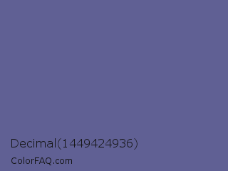 Decimal 1449424936 Color is a normal blue color and the nearest color is Dark Blue Gray #666699. Hex code #606094 and RGB value is rgb(96,96,148). In RGB color space, this color is composed of 38% red, 38% green, 58% blue, In CMYK color space, this color is composed of 35% cyan, 35% magenta, 0% yellow , 42% black , In HSL color space, this color has a hue angle of 240° , 21% saturation and 48% lightness.