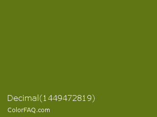 Decimal 1449472819 Color is a dark lime color and the nearest color is Fern Frond #657220. Hex code #607615 and RGB value is rgb(96,118,21). In RGB color space, this color is composed of 38% red, 46% green, 8% blue, In CMYK color space, this color is composed of 19% cyan, 0% magenta, 82% yellow , 54% black , In HSL color space, this color has a hue angle of 74° , 70% saturation and 27% lightness.