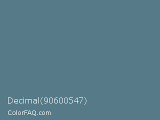 Decimal 90600547 Color is a normal blue color and the nearest color is Smalt Blue #51808f. Hex code #567a87 and RGB value is rgb(86,122,135). In RGB color space, this color is composed of 34% red, 48% green, 53% blue, In CMYK color space, this color is composed of 36% cyan, 10% magenta, 0% yellow , 47% black , In HSL color space, this color has a hue angle of 196° , 22% saturation and 43% lightness.