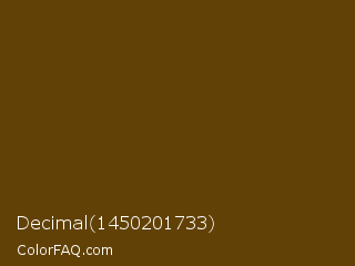 Decimal 1450201733 Color is a very dark orange color and the nearest color is Nutmeg Wood Finish #683600. Hex code #614105 and RGB value is rgb(97,65,5). In RGB color space, this color is composed of 38% red, 25% green, 2% blue, In CMYK color space, this color is composed of 0% cyan, 33% magenta, 95% yellow , 62% black , In HSL color space, this color has a hue angle of 39° , 90% saturation and 20% lightness.