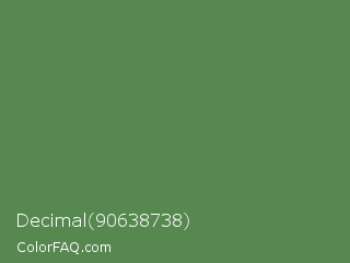 Decimal 90638738 Color is a normal green color and the nearest color is Hippie Green #53824b. Hex code #568850 and RGB value is rgb(86,136,80). In RGB color space, this color is composed of 34% red, 53% green, 31% blue, In CMYK color space, this color is composed of 37% cyan, 0% magenta, 41% yellow , 47% black , In HSL color space, this color has a hue angle of 114° , 26% saturation and 42% lightness.