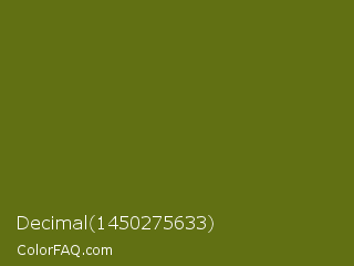 Decimal 1450275633 Color is a dark yellow color and the nearest color is Fern Frond #657220. Hex code #617013 and RGB value is rgb(97,112,19). In RGB color space, this color is composed of 38% red, 44% green, 7% blue, In CMYK color space, this color is composed of 13% cyan, 0% magenta, 83% yellow , 56% black , In HSL color space, this color has a hue angle of 70° , 71% saturation and 26% lightness.