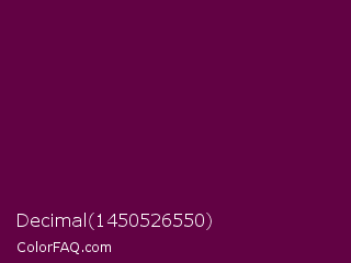 Decimal 1450526550 Color is a very dark magenta color and the nearest color is Pompadour #660045. Hex code #620244 and RGB value is rgb(98,2,68). In RGB color space, this color is composed of 38% red, 1% green, 27% blue, In CMYK color space, this color is composed of 0% cyan, 98% magenta, 31% yellow , 62% black , In HSL color space, this color has a hue angle of 319° , 96% saturation and 20% lightness.