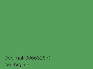 Decimal 90665287 Color is a normal green color and the nearest color is Fruit Salad #4f9d5d. Hex code #56a05b and RGB value is rgb(86,160,91). In RGB color space, this color is composed of 34% red, 63% green, 36% blue, In CMYK color space, this color is composed of 46% cyan, 0% magenta, 43% yellow , 37% black , In HSL color space, this color has a hue angle of 124° , 30% saturation and 48% lightness.