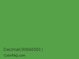 Decimal 90666561 Color is a normal green color and the nearest color is Apple #4fa83d. Hex code #56a249 and RGB value is rgb(86,162,73). In RGB color space, this color is composed of 34% red, 64% green, 29% blue, In CMYK color space, this color is composed of 47% cyan, 0% magenta, 55% yellow , 36% black , In HSL color space, this color has a hue angle of 111° , 38% saturation and 46% lightness.