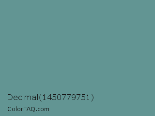 Decimal 1450779751 Color is a normal cyan color and the nearest color is Patina #639a8f. Hex code #629593 and RGB value is rgb(98,149,147). In RGB color space, this color is composed of 38% red, 58% green, 58% blue, In CMYK color space, this color is composed of 34% cyan, 0% magenta, 1% yellow , 42% black , In HSL color space, this color has a hue angle of 178° , 21% saturation and 48% lightness.