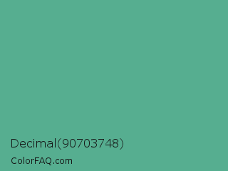 Decimal 90703748 Color is a normal green color and the nearest color is Polished Pine #5da493. Hex code #56ae90 and RGB value is rgb(86,174,144). In RGB color space, this color is composed of 34% red, 68% green, 56% blue, In CMYK color space, this color is composed of 51% cyan, 0% magenta, 17% yellow , 32% black , In HSL color space, this color has a hue angle of 160° , 35% saturation and 51% lightness.