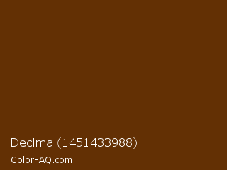 Decimal 1451433988 Color is a very dark orange color and the nearest color is Carnaby Tan #5c2e01. Hex code #633004 and RGB value is rgb(99,48,4). In RGB color space, this color is composed of 39% red, 19% green, 2% blue, In CMYK color space, this color is composed of 0% cyan, 52% magenta, 96% yellow , 61% black , In HSL color space, this color has a hue angle of 28° , 92% saturation and 20% lightness.