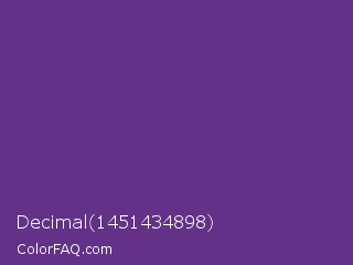 Decimal 1451434898 Color is a normal purple color and the nearest color is Eminence #6c3082. Hex code #633188 and RGB value is rgb(99,49,136). In RGB color space, this color is composed of 39% red, 19% green, 53% blue, In CMYK color space, this color is composed of 27% cyan, 64% magenta, 0% yellow , 47% black , In HSL color space, this color has a hue angle of 274° , 47% saturation and 36% lightness.