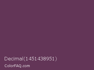 Decimal 1451438951 Color is a dark magenta color and the nearest color is Ube Halaya #663854. Hex code #633557 and RGB value is rgb(99,53,87). In RGB color space, this color is composed of 39% red, 21% green, 34% blue, In CMYK color space, this color is composed of 0% cyan, 46% magenta, 12% yellow , 61% black , In HSL color space, this color has a hue angle of 316° , 30% saturation and 30% lightness.