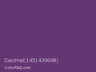 Decimal 1451439698 Color is a normal purple color and the nearest color is Imperial #602f6b. Hex code #633674 and RGB value is rgb(99,54,116). In RGB color space, this color is composed of 39% red, 21% green, 45% blue, In CMYK color space, this color is composed of 15% cyan, 53% magenta, 0% yellow , 55% black , In HSL color space, this color has a hue angle of 284° , 36% saturation and 33% lightness.