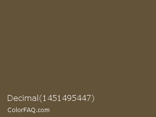 Decimal 1451495447 Color is a normal orange color and the nearest color is Hemlock #5e5d3b. Hex code #635339 and RGB value is rgb(99,83,57). In RGB color space, this color is composed of 39% red, 33% green, 22% blue, In CMYK color space, this color is composed of 0% cyan, 16% magenta, 42% yellow , 61% black , In HSL color space, this color has a hue angle of 37° , 27% saturation and 31% lightness.