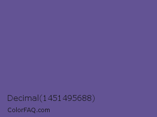 Decimal 1451495688 Color is a normal indigo color and the nearest color is Butterfly Bush #624e9a. Hex code #635394 and RGB value is rgb(99,83,148). In RGB color space, this color is composed of 39% red, 33% green, 58% blue, In CMYK color space, this color is composed of 33% cyan, 44% magenta, 0% yellow , 42% black , In HSL color space, this color has a hue angle of 255° , 28% saturation and 45% lightness.