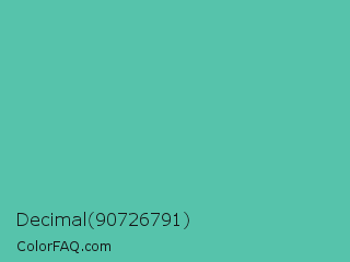 Decimal 90726791 Color is a normal cyan color and the nearest color is Tradewind #5fb3ac. Hex code #56c3ab and RGB value is rgb(86,195,171). In RGB color space, this color is composed of 34% red, 76% green, 67% blue, In CMYK color space, this color is composed of 56% cyan, 0% magenta, 12% yellow , 24% black , In HSL color space, this color has a hue angle of 167° , 48% saturation and 55% lightness.