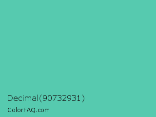 Decimal 90732931 Color is a normal cyan color and the nearest color is Eucalyptus #44d7a8. Hex code #56caaf and RGB value is rgb(86,202,175). In RGB color space, this color is composed of 34% red, 79% green, 69% blue, In CMYK color space, this color is composed of 57% cyan, 0% magenta, 13% yellow , 21% black , In HSL color space, this color has a hue angle of 166° , 52% saturation and 56% lightness.