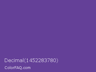 Decimal 1452283780 Color is a normal violet color and the nearest color is Royal Purple #6b3fa0. Hex code #644098 and RGB value is rgb(100,64,152). In RGB color space, this color is composed of 39% red, 25% green, 60% blue, In CMYK color space, this color is composed of 34% cyan, 58% magenta, 0% yellow , 40% black , In HSL color space, this color has a hue angle of 265° , 41% saturation and 42% lightness.