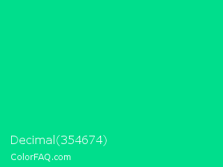 Decimal 354674 Color is a normal green color and the nearest color is Caribbean Green #00cc99. Hex code #00de8c and RGB value is rgb(0,222,140). In RGB color space, this color is composed of 0% red, 87% green, 55% blue, In CMYK color space, this color is composed of 100% cyan, 0% magenta, 37% yellow , 13% black , In HSL color space, this color has a hue angle of 158° , 100% saturation and 44% lightness.