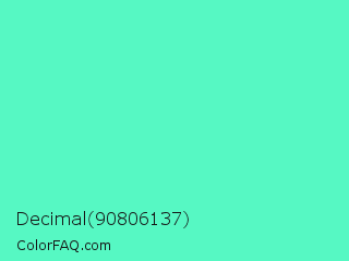 Decimal 90806137 Color is a light green color and the nearest color is Turquoise #40e0d0. Hex code #56f8c3 and RGB value is rgb(86,248,195). In RGB color space, this color is composed of 34% red, 97% green, 76% blue, In CMYK color space, this color is composed of 65% cyan, 0% magenta, 21% yellow , 3% black , In HSL color space, this color has a hue angle of 160° , 92% saturation and 65% lightness.