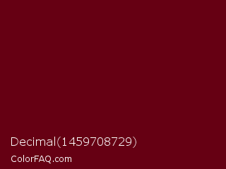 Decimal 1459708729 Color is a very dark red color and the nearest color is Rosewood #65000b. Hex code #660013 and RGB value is rgb(102,0,19). In RGB color space, this color is composed of 40% red, 0% green, 7% blue, In CMYK color space, this color is composed of 0% cyan, 100% magenta, 81% yellow , 60% black , In HSL color space, this color has a hue angle of 349° , 100% saturation and 20% lightness.