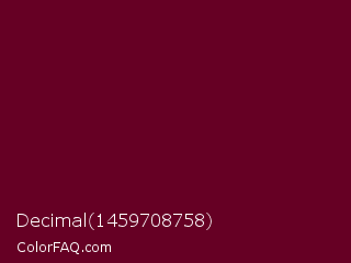 Decimal 1459708758 Color is a very dark rose color and the nearest color is Black Rose #67032d. Hex code #660024 and RGB value is rgb(102,0,36). In RGB color space, this color is composed of 40% red, 0% green, 14% blue, In CMYK color space, this color is composed of 0% cyan, 100% magenta, 65% yellow , 60% black , In HSL color space, this color has a hue angle of 339° , 100% saturation and 20% lightness.