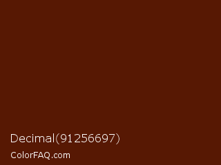 Decimal 91256697 Color is a very dark color and the nearest color is French Puce #4e1609. Hex code #571803 and RGB value is rgb(87,24,3). In RGB color space, this color is composed of 34% red, 9% green, 1% blue, In CMYK color space, this color is composed of 0% cyan, 72% magenta, 97% yellow , 66% black , In HSL color space, this color has a hue angle of 15° , 93% saturation and 18% lightness.