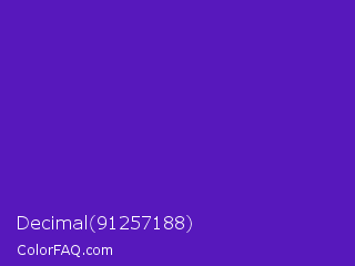 Decimal 91257188 Color is a normal violet color and the nearest color is Purple Heart Crayola #652dc1. Hex code #5718bc and RGB value is rgb(87,24,188). In RGB color space, this color is composed of 34% red, 9% green, 74% blue, In CMYK color space, this color is composed of 54% cyan, 87% magenta, 0% yellow , 26% black , In HSL color space, this color has a hue angle of 263° , 77% saturation and 42% lightness.