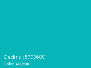 Decimal 5703688 Color is a normal cyan color and the nearest color is Tiffany Blue #0abab5. Hex code #08b5b8 and RGB value is rgb(8,181,184). In RGB color space, this color is composed of 3% red, 71% green, 72% blue, In CMYK color space, this color is composed of 96% cyan, 2% magenta, 0% yellow , 28% black , In HSL color space, this color has a hue angle of 181° , 92% saturation and 38% lightness.