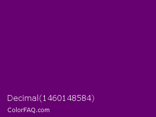 Decimal 1460148584 Color is a very dark magenta color and the nearest color is Patriarch #800080. Hex code #670070 and RGB value is rgb(103,0,112). In RGB color space, this color is composed of 40% red, 0% green, 44% blue, In CMYK color space, this color is composed of 8% cyan, 100% magenta, 0% yellow , 56% black , In HSL color space, this color has a hue angle of 295° , 100% saturation and 22% lightness.