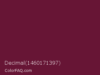 Decimal 1460171397 Color is a dark rose color and the nearest color is Wine Berry #591d35. Hex code #671535 and RGB value is rgb(103,21,53). In RGB color space, this color is composed of 40% red, 8% green, 21% blue, In CMYK color space, this color is composed of 0% cyan, 80% magenta, 49% yellow , 60% black , In HSL color space, this color has a hue angle of 337° , 66% saturation and 24% lightness.