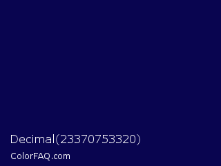 Decimal 23370753320 Color is a very dark indigo color and the nearest color is Stratos #000741. Hex code #090550 and RGB value is rgb(9,5,80). In RGB color space, this color is composed of 4% red, 2% green, 31% blue, In CMYK color space, this color is composed of 89% cyan, 94% magenta, 0% yellow , 69% black , In HSL color space, this color has a hue angle of 243° , 88% saturation and 17% lightness.