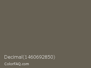 Decimal 1460692850 Color is a normal orange color and the nearest color is Soya Bean #6a6051. Hex code #676154 and RGB value is rgb(103,97,84). In RGB color space, this color is composed of 40% red, 38% green, 33% blue, In CMYK color space, this color is composed of 0% cyan, 6% magenta, 18% yellow , 60% black , In HSL color space, this color has a hue angle of 41° , 10% saturation and 37% lightness.