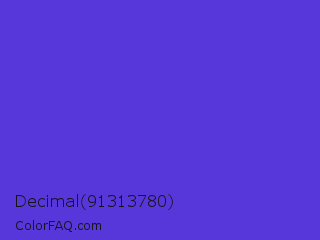 Decimal 91313780 Color is a normal indigo color and the nearest color is Iris #5a4fcf. Hex code #5736da and RGB value is rgb(87,54,218). In RGB color space, this color is composed of 34% red, 21% green, 85% blue, In CMYK color space, this color is composed of 60% cyan, 75% magenta, 0% yellow , 15% black , In HSL color space, this color has a hue angle of 252° , 69% saturation and 53% lightness.