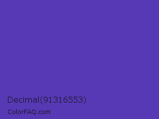 Decimal 91316553 Color is a normal indigo color and the nearest color is Ocean Blue #4f42b5. Hex code #5738b5 and RGB value is rgb(87,56,181). In RGB color space, this color is composed of 34% red, 22% green, 71% blue, In CMYK color space, this color is composed of 52% cyan, 69% magenta, 0% yellow , 29% black , In HSL color space, this color has a hue angle of 255° , 53% saturation and 46% lightness.