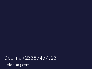 Decimal 23387457123 Color is a very dark blue color and the nearest color is Haiti #1b1035. Hex code #181937 and RGB value is rgb(24,25,55). In RGB color space, this color is composed of 9% red, 10% green, 22% blue, In CMYK color space, this color is composed of 56% cyan, 55% magenta, 0% yellow , 78% black , In HSL color space, this color has a hue angle of 238° , 39% saturation and 15% lightness.