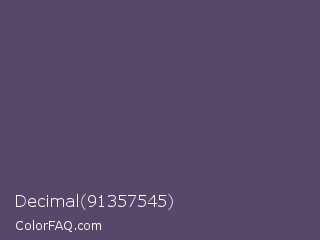 Decimal 91357545 Color is a normal violet color and the nearest color is Mulled Wine #4e4562. Hex code #574869 and RGB value is rgb(87,72,105). In RGB color space, this color is composed of 34% red, 28% green, 41% blue, In CMYK color space, this color is composed of 17% cyan, 31% magenta, 0% yellow , 59% black , In HSL color space, this color has a hue angle of 267° , 19% saturation and 35% lightness.