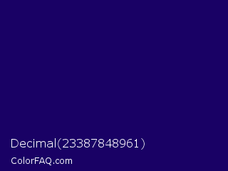 Decimal 23387848961 Color is a very dark indigo color and the nearest color is Paua #260368. Hex code #190165 and RGB value is rgb(25,1,101). In RGB color space, this color is composed of 10% red, 0% green, 40% blue, In CMYK color space, this color is composed of 75% cyan, 99% magenta, 0% yellow , 60% black , In HSL color space, this color has a hue angle of 254° , 98% saturation and 20% lightness.