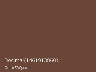 Decimal 1461913860 Color is a normal orange color and the nearest color is Tuscan Brown Coffee #6f4e37. Hex code #694638 and RGB value is rgb(105,70,56). In RGB color space, this color is composed of 41% red, 27% green, 22% blue, In CMYK color space, this color is composed of 0% cyan, 33% magenta, 47% yellow , 59% black , In HSL color space, this color has a hue angle of 17° , 30% saturation and 32% lightness.