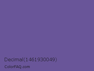 Decimal 1461930049 Color is a normal indigo color and the nearest color is Butterfly Bush #624e9a. Hex code #695599 and RGB value is rgb(105,85,153). In RGB color space, this color is composed of 41% red, 33% green, 60% blue, In CMYK color space, this color is composed of 31% cyan, 44% magenta, 0% yellow , 40% black , In HSL color space, this color has a hue angle of 258° , 29% saturation and 47% lightness.