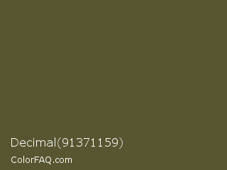 Decimal 91371159 Color is a dark yellow color and the nearest color is Verdigris #5d5e37. Hex code #575631 and RGB value is rgb(87,86,49). In RGB color space, this color is composed of 34% red, 34% green, 19% blue, In CMYK color space, this color is composed of 0% cyan, 1% magenta, 44% yellow , 66% black , In HSL color space, this color has a hue angle of 58° , 28% saturation and 27% lightness.