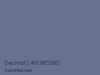 Decimal 1461985280 Color is a normal blue color and the nearest color is Storm Gray #717486. Hex code #697190 and RGB value is rgb(105,113,144). In RGB color space, this color is composed of 41% red, 44% green, 56% blue, In CMYK color space, this color is composed of 27% cyan, 22% magenta, 0% yellow , 44% black , In HSL color space, this color has a hue angle of 228° , 16% saturation and 49% lightness.