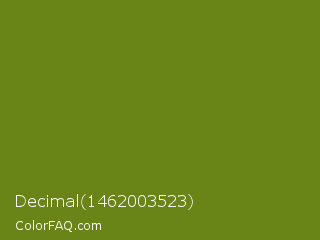 Decimal 1462003523 Color is a dark lime color and the nearest color is Olive Drab #6b8e23. Hex code #698417 and RGB value is rgb(105,132,23). In RGB color space, this color is composed of 41% red, 52% green, 9% blue, In CMYK color space, this color is composed of 20% cyan, 0% magenta, 83% yellow , 48% black , In HSL color space, this color has a hue angle of 75° , 70% saturation and 30% lightness.