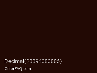 Decimal 23394080886 Color is a almost black red color and the nearest color is Kilamanjaro #240c02. Hex code #220904 and RGB value is rgb(34,9,4). In RGB color space, this color is composed of 13% red, 4% green, 2% blue, In CMYK color space, this color is composed of 0% cyan, 74% magenta, 88% yellow , 87% black , In HSL color space, this color has a hue angle of 10° , 79% saturation and 7% lightness.