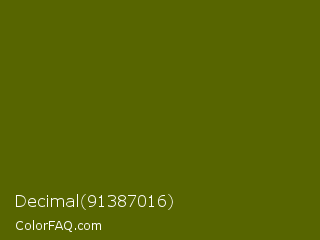 Decimal 91387016 Color is a very dark yellow color and the nearest color is Saratoga #555b10. Hex code #576500 and RGB value is rgb(87,101,0). In RGB color space, this color is composed of 34% red, 40% green, 0% blue, In CMYK color space, this color is composed of 14% cyan, 0% magenta, 100% yellow , 60% black , In HSL color space, this color has a hue angle of 68° , 100% saturation and 20% lightness.